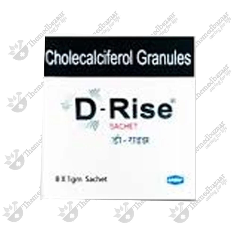 D-Rise Granules 1 gm is used to treat low blood calcium levels. It effectively treats various conditions in the body like Vitamin D deficiency, osteoporosis, hypoparathyroidism, latent tetany and rickets or osteomalacia. D-Rise Granules 1 gm contains Cholecalciferol (Vitamin D3). Cholecalciferol is a steroid hormone produced in the skin when exposed to ultraviolet light or obtained from food sources